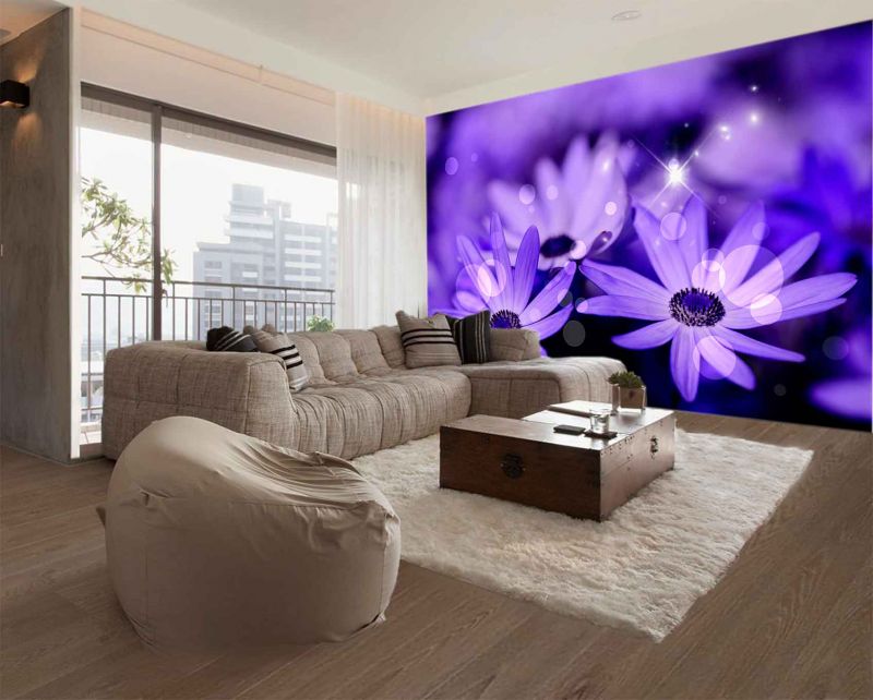 Mor Mavi Çiçekler 3D Duvar Kağıdı