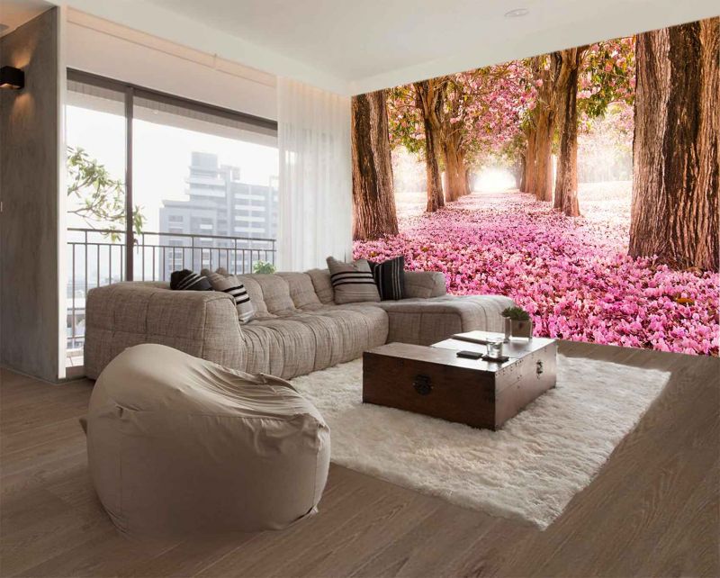 Pembe Çiçekli Orman Yolu 3D Duvar Kağıdı